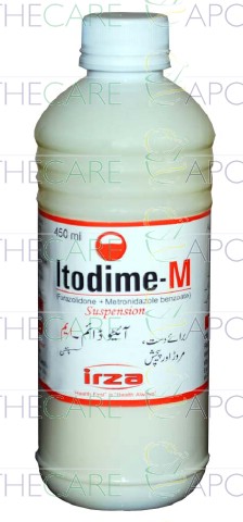 Product Name: Itodime-M Susp 450mlProduct Form: SuspensionPack Size: 450mlMarketed By: IRZA PHARMA PVT LTDGeneric Category: Anti-AmoebicIngredients: Each 5ml contain: Furazolidone 25mg, Metronidazole Benzoate 75mg