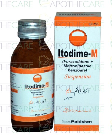Product Name: Itodime-M Susp 60mlProduct Form: SuspensionPack Size: 60mlMarketed By: IRZA PHARMA PVT LTDGeneric Category: Anti-AmoebicIngredients: Each 5ml contain: Furazolidone 25mg, Metronidazole Benzoate 75mg
