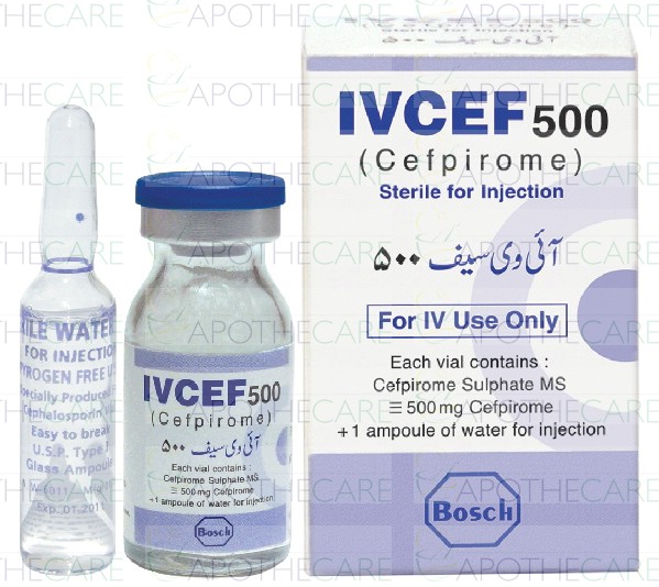Product Name: Ivcef Inj 500mg 1VialProduct Form: InjectionPack Size: 1 VialMarketed By: BOSCH PHARMACEUTICALS (PVT) LTDGeneric Category: CEPHALOSPORIN ANTIBIOTICIngredients: Cefpirome