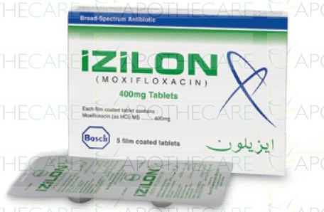 Product Name: IZILON Tab 400mg 1X5'sProduct Form: TabletPack Size: 1x5'sMarketed By: BOSCH PHARMACEUTICALS (PVT) LTDGeneric Category: QUINOLONE ANTI-BACTERIALIngredients: Moxifloxacin