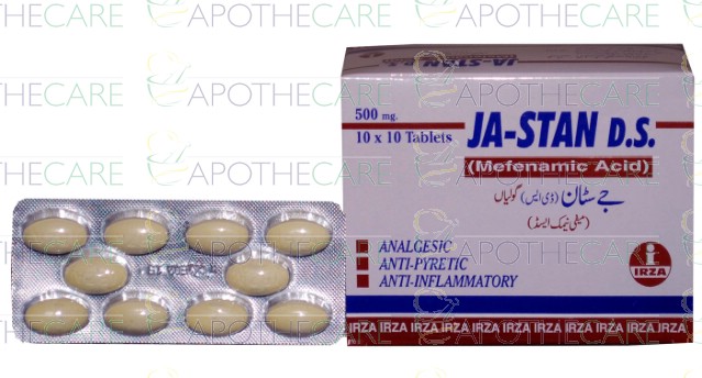 Product Name: Ja-Stan D.S Tab 500mg 10x10'sProduct Form: TabletsPack Size: 10x10'sMarketed By: IRZA PHARMA PVT LTDGeneric Category: NSAIDIngredients: Mefenamic Acid