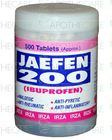 Product Name: Jaefen Tab 200mg 1x500'sProduct Form: TabletPack Size: 1x500'sMarketed By: IRZA PHARMA PVT LTDGeneric Category: NSAIDIngredients: Ibuprofen