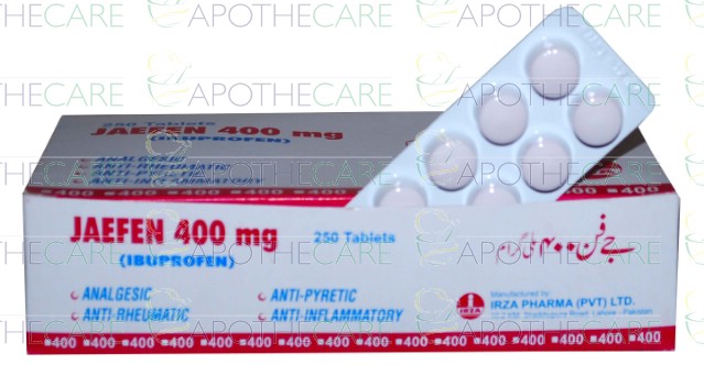 Product Name: Jaefen Tab 400mg 25x10'sProduct Form: TabletPack Size: 25x10'sMarketed By: IRZA PHARMA PVT LTDGeneric Category: NSAIDIngredients: Ibuprofen