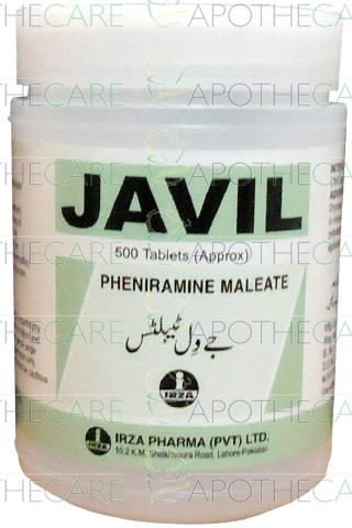 Product Name: Javil Tab 25mg 1x500'sProduct Form: TabletPack Size: 1x500'sMarketed By: IRZA PHARMA PVT LTDGeneric Category: ANTI-HISTAMINEIngredients: Pheniramine Maleate