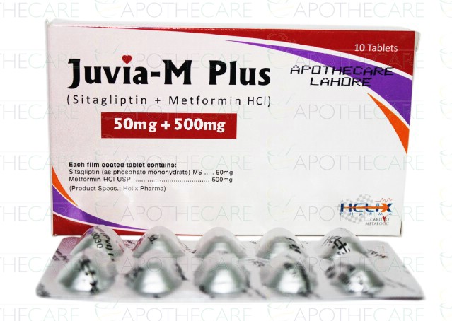 Product Name: Juvia-M Plus Tab 50mg/500mg 10'sProduct Form: TabletsPack Size: 10'sMarketed By: Helix PharmaGeneric Category: Oral HypoglycemicsIngredients: Sitagliptin 50mg, Metformin 500mg