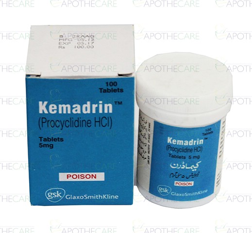 Product Name: Kemadrin Tab 5mg 100'sProduct Form: TabletsPack Size: 100'sMarketed By: Glaxosmithkline Pakistan LimitedGeneric Category: ANTI-PARKINSONISMIngredients: Procyclidine