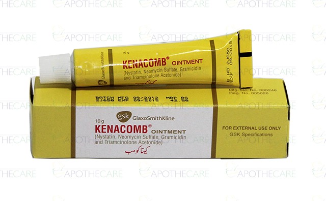 Product Name: KENACOMB Oint 10gProduct Form: OintmentPack Size: 10gMarketed By: Glaxosmithkline Pakistan LimitedGeneric Category: ANTI-BACTERIAL + CORTICOSTEROIDSIngredients: Triamcinolone, Neomycin, Gramicidin and Nystatin,