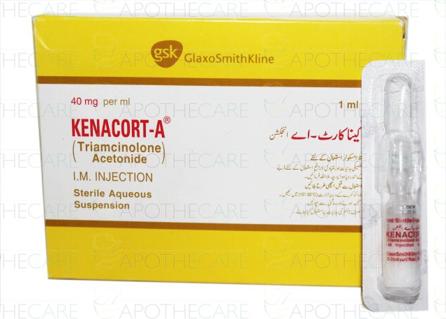 Product Name: Kenacort A Inj 40mg 1Ampx1mlProduct Form: InjectionPack Size: 1Ampx1mlMarketed By: GLAXOSMITHKLINE Generic Category: CorticosteroidsIngredients: Triamcinolone Acetonide