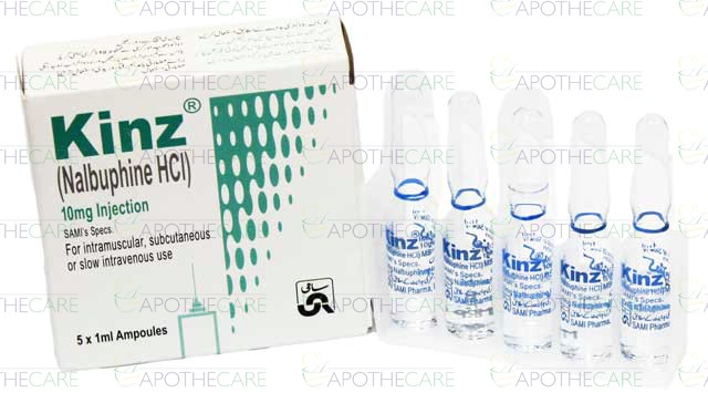 Product Name: Kinz Inj 10mg 5Ampx1mlProduct Form: InjectionPack Size: 5Ampx1mlMarketed By: SAMI PHARMACEUTICALSGeneric Category: OPIOID ANALGESICIngredients: Nalbuphine HCl