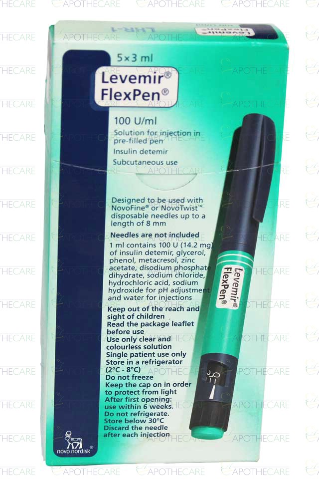 Product Name: Levemir FlexPen Inj 100IU 5PFPx3mlProduct Form: InjectionPack Size: 5PFPx3mlMarketed By: NOVO NORDISK PHARMA PVT LTDGeneric Category: Long-Acting InsulinsIngredients: Insulin DetemirStorage Condition: Store at 2 - 80C (Do not freeze)