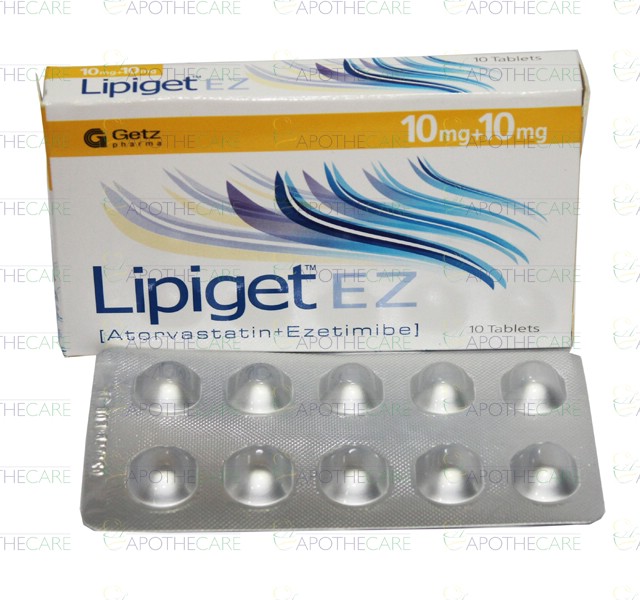 Product Name: Lipiget EZ Tab 10mg/10mg 10's 96 PacksProduct Form: TabletPack Size: 96 Packs of 10'sMarketed By: GETZ PHARMA PAKISTAN (PVT) LTDGeneric Category: StatinsIngredients: Atorvastatin 10mg, Ezetimibe 10mg