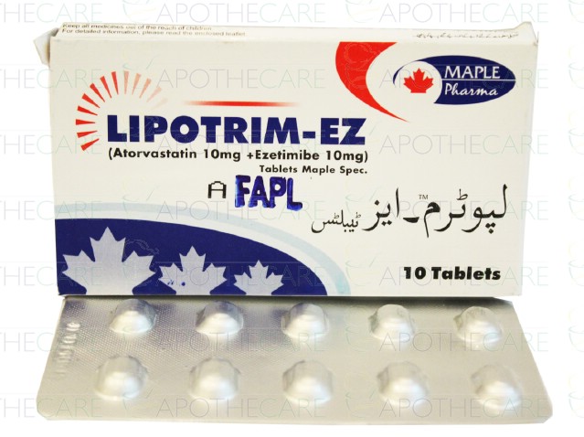 Product Name: Lipotrim-EZ Tab 10mg/10mg 10'sProduct Form: TabletsPack Size: 10'sMarketed By: Maple Pharmaceutical (Pvt) LtdGeneric Category: Anti-LipidemicIngredients: Atorvastatin 10mg , Ezetimibe 10mg