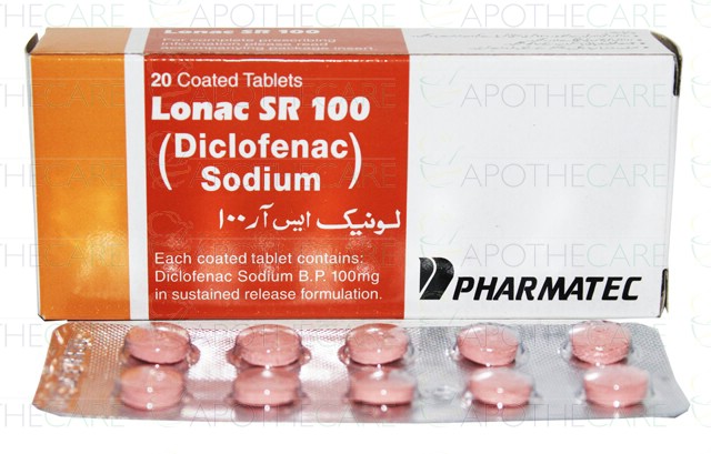 Product Name: Lonac SR 100 Tab 100mg 20'sProduct Form: TabletsPack Size: 20'sMarketed By: PharmatecGeneric Category: NSAIDIngredients: Diclofenac sodium