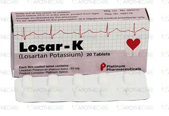 Product Name: Losar-K Tab 50mg 20'sProduct Form: TabletsPack Size: 20'sMarketed By: Platinum Pharmaceuticals (Pvt) LtdGeneric Category: Anti-HypertensiveIngredients: Losartan Potassium