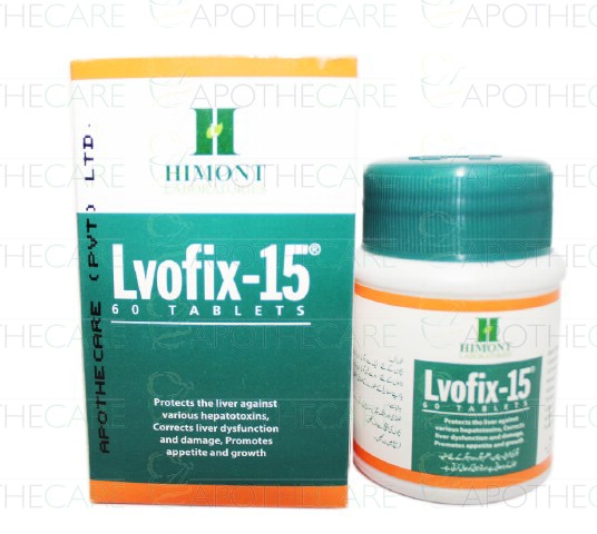 Product Name: Lvofix-15 SS Tab 60'sProduct Form: TabletsPack Size: 60'sMarketed By: Himont Pharma (Pvt) Ltd.Generic Category: Liver ProtectantIngredients: Each Tablet contains Powder: Capparis spinosa 65 mg, Cichorium intybus 65 mg, Mandur bhasma 33mg, Solanum nigrum 32 mg, Terminalia arjuna 32mg1 Cassia occidentalis 16mg, Achillea millefolium 16mg, Tamarix laallica 16ma.
