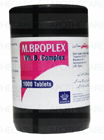 Product Name: M.Broplex Tab 1000'sProduct Form: TabletPack Size: 1000'sMarketed By: Jawa PharmaceuticalsGeneric Category: B-ComplesIngredients: Vitamin B Complex