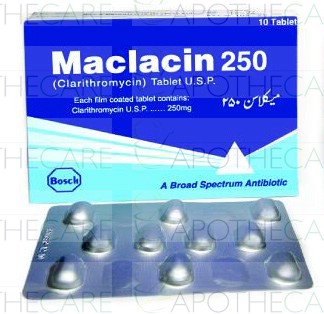 Product Name: MACLACIN Tab 250mg 10'sProduct Form: TabletPack Size: 10'sMarketed By: BOSCH PHARMACEUTICALS (PVT) LTDGeneric Category: MACROLIDE ANTI-BACTERIALIngredients: Clarithromycin