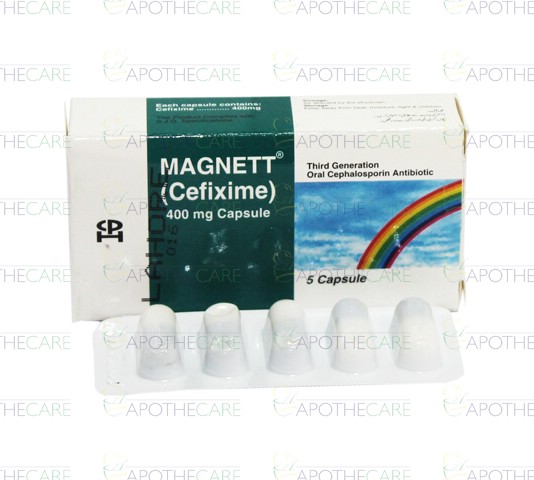 Product Name: Magnett Cap 400mg 5'sProduct Form: CapsulesPack Size: 5'sMarketed By: Continental pharmaGeneric Category: CEPHALOSPORIN ANTIBIOTICIngredients: Cefixime