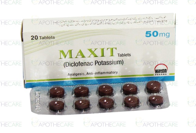 Product Name: Maxit Tab 50mg 20'sProduct Form: TabletsPack Size: 20'sMarketed By: Hilton Pharma (Pvt) Ltd.Generic Category: NSAIDIngredients: Diclofenac Potassium