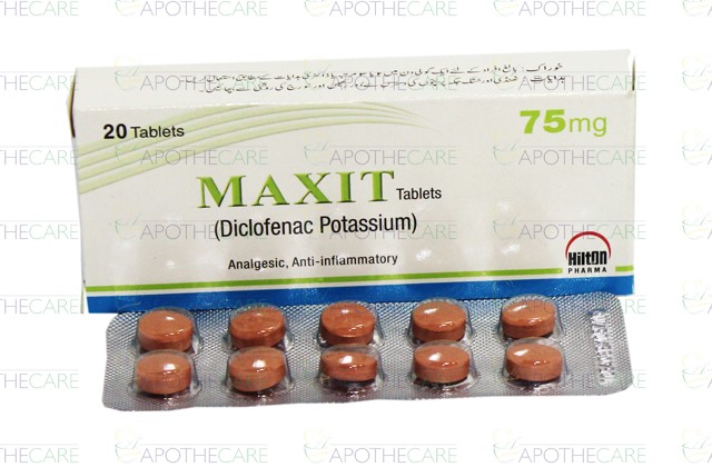 Product Name: Maxit Tab 75mg 20'sProduct Form: TabletsPack Size: 20'sMarketed By: Hilton Pharma (Pvt) Ltd.Generic Category: NSAIDIngredients: Diclofenac Potassium