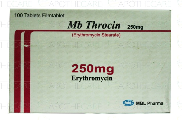 Product Name: Mb-Throcin Tab 250mg 10x10'sProduct Form: TabletsPack Size: 10x10'sMarketed By: MBL PharmaGeneric Category: Macrolide ANTI-BACTERIAL Ingredients: Erythromycin