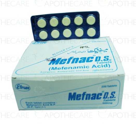 Product Name: Mefnac-DS Tab 500mg 200'sProduct Form: TabletsPack Size: 200'sMarketed By: EFROZE CHEMICAL PVT LTDGeneric Category: NSAIDIngredients: Mefenamic Acid