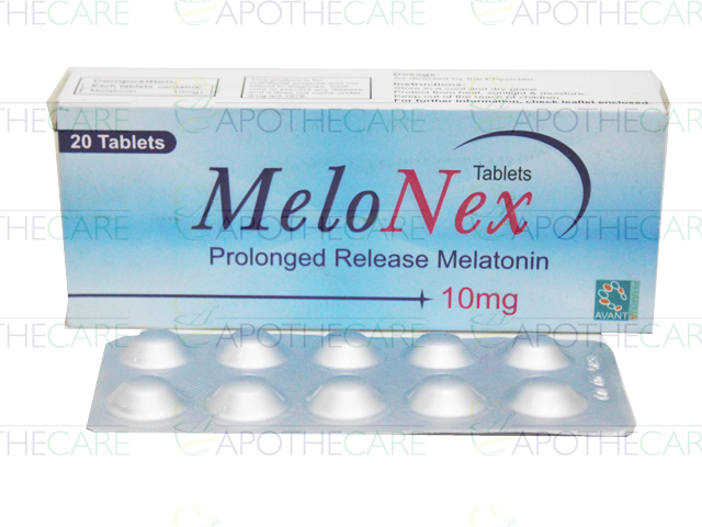Product Name: MeloNex Tab 10mg 20'sProduct Form: TabletsPack Size: 20’sMarketed By: Avant PharmaGeneric Category: Nutritional SupplementIngredients: Prolonged Release Melatonin