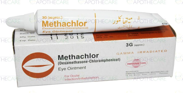 Product Name: Methachlor Eye Oint 3gProduct Form: OintmentPack Size: 3gMarketed By: Remington PharmaceuticalsGeneric Category: Corticosteroid + Anti-InfectiveIngredients: Dexamethasone 0.1%, Chloramphenicol 0.5%