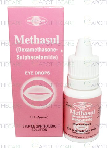 Product Name: Methasul Eye Drops 5mlProduct Form: DropsPack Size: 5mlMarketed By: Remington PharmaceuticalsGeneric Category: Anti Infective, CorticosteroidIngredients: Dexamethasone 0.1%, Sulphacetamide 10%
