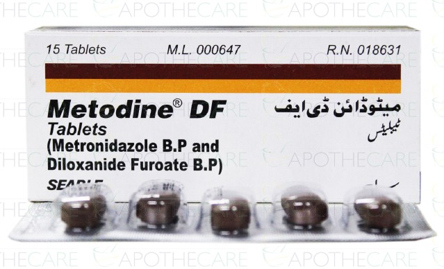 Product Name: Metodine DF Tab 400mg/500mg 15'sProduct Form: TabletsPack Size: 15'sMarketed By: Searle Pakistan LimitedGeneric Category: Anti-AmoebicIngredients: Metronidazole 400mg, Diloxanide Furoate 500mg