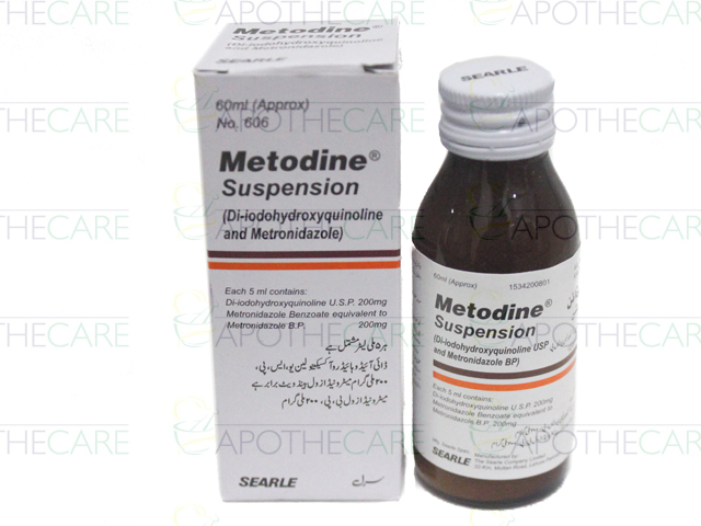 Product Name: Metodine Susp 60mlProduct Form: SuspensionPack Size: 60mlMarketed By: Searle Pakistan LimitedGeneric Category: Anti-AmoebicIngredients: Each 5ml contains: Metronidazole benzoate 321.6mg ,Di-Iodohydroxyquinoline 200mg