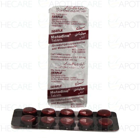 Product Name: Metodine Tab 325mg/250mg 10'sProduct Form: TabletPack Size: 10'sMarketed By: SearleGeneric Category: Anti-AmoebicIngredients: Metronidazole 250mg , Di-Iodohydroxyquinoline 325mg