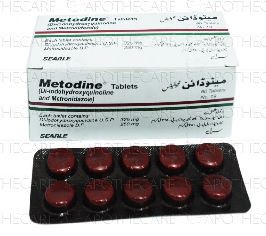 Product Name: Metodine Tab 325mg/250mg 60'sProduct Form: TabletsPack Size: 60'sMarketed By: Searle Pakistan LimitedGeneric Category: Anti-AmoebicIngredients: Metronidazole 250mg , Di-Iodohydroxyquinoline 325mg