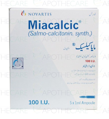 Product Name: Miacalcic Inj 100IU 5Ampx1mlProduct Form: Injection Pack Size: 5Ampx1mlMarketed By: NOVARTIS PHARMA PAKISTAN LTDGeneric Category: Anti-OsteoclasticIngredients: Salmo-calcitonin.synthStorage Condition: Store at 2 - 8°C (Do not freeze)