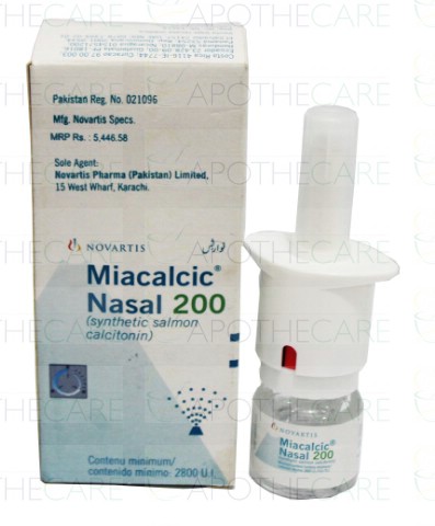 Product Name: Miacalcic Nasal Spray 200IU 1'sProduct Form: SprayPack Size: 1's Marketed By: NOVARTIS PHARMA PAKISTAN LTDGeneric Category: Anti-OsteoclasticIngredients: Salmo-calcitonin.synthStorage Condition: Store at 2 - 8°C (Do not freeze)