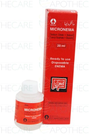 Product Name: Micronema Liq 20mlProduct Form: Liquid Pack Size: 20mlMarketed By: ATCO LABORATORIES (PVT) LTDGeneric Category: LaxativeIngredients: Sodium Citrate 450 mg, Sodium Lauryl Sulphate 75 mg, Glycerin 90%