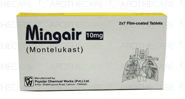 Product Name: Mingair Tab 10mg 14'sProduct Form: TabletsPack Size: 14'sMarketed By: Popular Chemical Work(Pvt) LtdGeneric Category: Anti-LeukotrieneIngredients: Montelukast