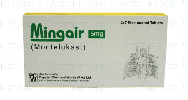 Product Name: Mingair Tab 5mg 14'sProduct Form: TabletsPack Size: 14'sMarketed By: Popular Chemical Work(Pvt) LtdGeneric Category: Anti-LeukotrieneIngredients: Montelukast