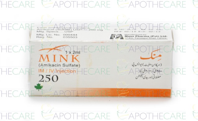 Product Name: Mink Inj 250mg 1Vialx2mlProduct Form: InjectionPack Size: 1Vialx2ml Marketed By: MASS PHARMAGeneric Category: Aminoglycoside Anti-BacterialIngredients: Amikacin Sulphate