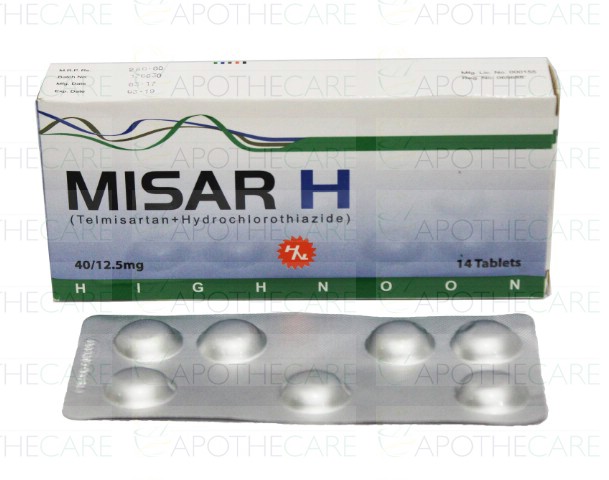 Product Name: Misar-H Tab 40mg/12.5mg 14'sProduct Form: TabletsPack Size: 14'sMarketed By: Highnoon Laboratories LTDGeneric Category: Anti-HypertensiveIngredients: Telmisartan 40mg, Hydrochlorothiazide 12.5mg