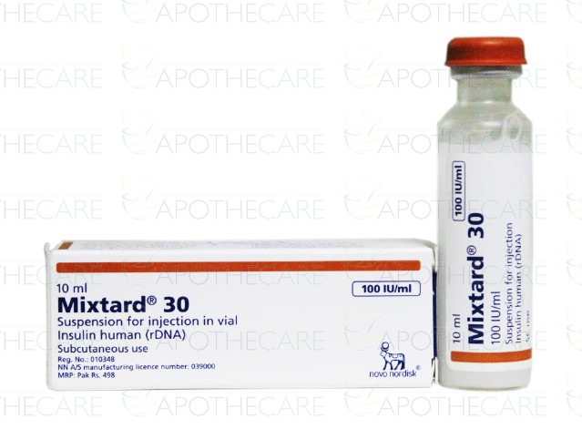 Product Name: Mixtard 30 HM Inj 100IU 1Vialx10mlProduct Form: InjectionPack Size: 1Vialx10mlMarketed By: NOVO NORDISK PHARMA PVT LTDGeneric Category: Intermediate-acting combined with Fast-acting InsulinsIngredients: Human Soluble Insulin 30%, Isophane Insulin 70%Storage Condition: Store at 2 - 80C (Do not freeze)