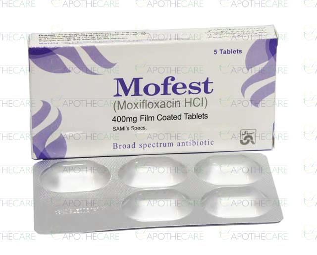 Product Name: MOFEST Tab 400mg 5'sProduct Form: TabletsPack Size: 5'sMarketed By: SAMI PHARMACEUTICALSGeneric Category: QUINOLONES ANTI-BACTERIALIngredients: Moxifloxacin HCl