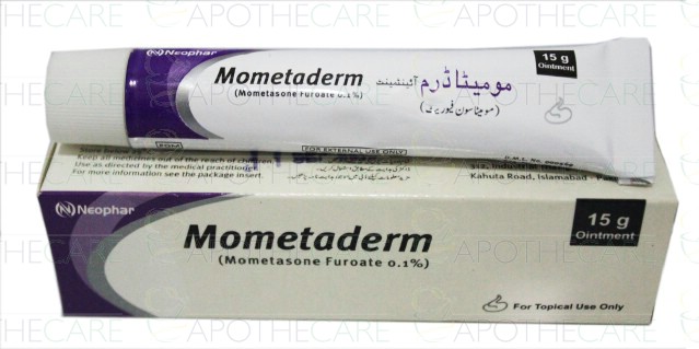 Product Name: Mometaderm Oint 0.1% 15gProduct Form: OintmentPack Size: 15gMarketed By: Noephar HealthcareGeneric Category: CortocosteroidIngredients: Mometasone Furoate