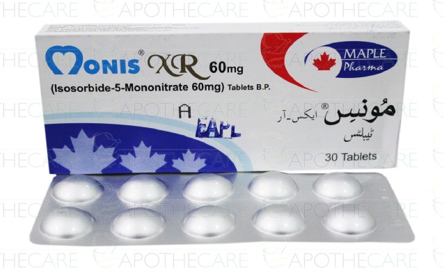 Product Name: Monis XR Tab 60mg 30'sProduct Form: TabletsPack Size: 30'sMarketed By: Maple Pharmaceutical (Pvt) LtdGeneric Category: NitratesIngredients: Isosorbide Mononitrate