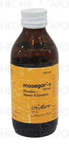 Product Name: Mosegor-V Syp 120mlProduct Form: SyrupPack Size: 120mlMarketed By: NOVARTIS PHARMA PAKISTAN LTDGeneric Category: Appetite StimulantIngredients: Each 5ml contains: Nicotinamide 5.25mg, Pizotifen 0.25mg , Riboflavin (Vitamin B2) 1.31mg, Thiamine HCl (Vitamin B1)0.88mg, Pyridoxine 0.77mg