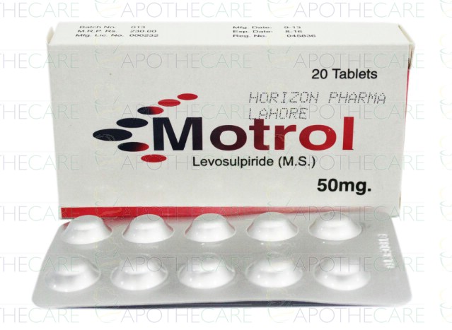 Product Name: Motrol Tab 50mg 2x10'sProduct Form: TabletsPack Size: 2x10'sMarketed By: Wilshire Laboratories (Pvt) LtdGeneric Category: PsychosisIngredients: Levosulpiride