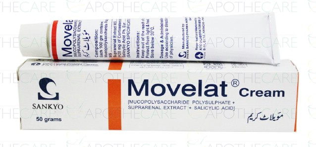 Product Name: MOVELAT Cream 50gmProduct Form: CreamPack Size: 50gmMarketed By: ATCO LABORATORIES (PVT) LTDGeneric Category: Analgesic Ingredients: Mucopolysaccharide Polysulphate MS 0.2gm, Suprarenal Extract MS 1.0gm (=20 mg of Corticosteroids), Salicylic Acid Ph.Eur 2.0gm