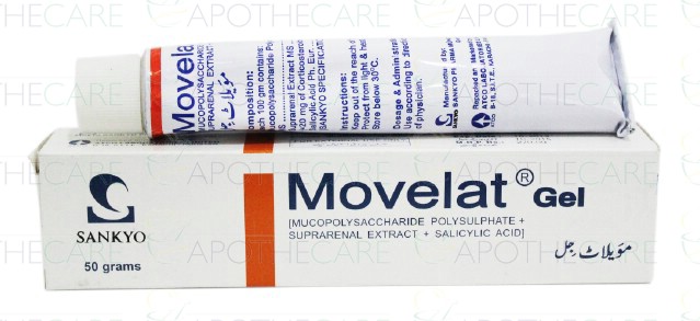 Product Name: MOVELAT Gel 50gmProduct Form: GelPack Size: 50gmMarketed By: ATCO LABORATORIES (PVT) LTDGeneric Category: Analgesic Ingredients: Mucopolysaccharide Polysulphate MS 0.2gm, Suprarenal Extract MS 1.0gm (=20 mg of Corticosteroids), Salicylic Acid Ph.Eur 2.0gm