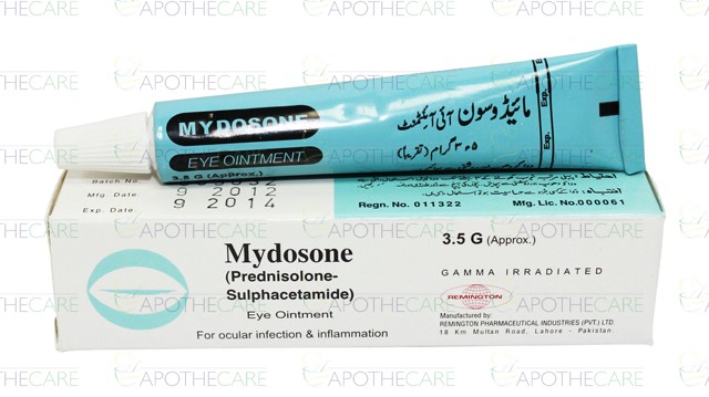 Product Name: Mydosone Eye Oint 3.5gProduct Form: OintmentPack Size: 3.5gMarketed By: Remington PharmaceuticalsGeneric Category: Anti-Infective,CorticosteroidIngredients: Sodium Sulphacetamide 10%w/w, Prednisolone Acetate 0.25%w/w