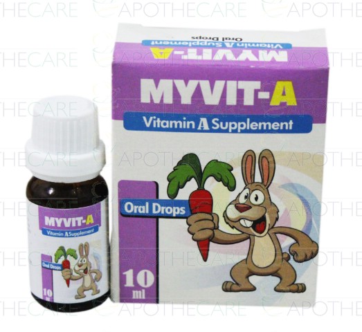 Product Name: Myvit-A Oral Drops 10mlProduct Form: DropsPack Size: 10mlMarketed By: GLOBAL PHARMAGeneric Category: Vitamin SupplementIngredients: Vitamin A